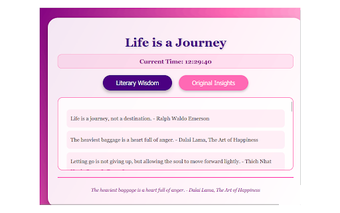 الحياة رحلة هي إضافة لمتصفح كروم توفر للمستخدمين مجموعة من 100 اقتباس من التأمل، منظمة في فئتين متميزتين: حكمة أدبية ورؤى أصلية. تحتوي قسم الحكمة الأدبية على 15 اقتباسًا من مؤلفين معروفين وقادة روحيين، بينما تحتوي فئة الرؤى الأصلية على 85 اقتباسًا مستوحى من الفلسفة البوذية ومفهوم السفر الخفيف. تم تصميم واجهة الإضافة لتكون سهلة الاستخدام، مع أزرار مستديرة وعرض قابل للتمرير يعزز تجربة المستخدم.
